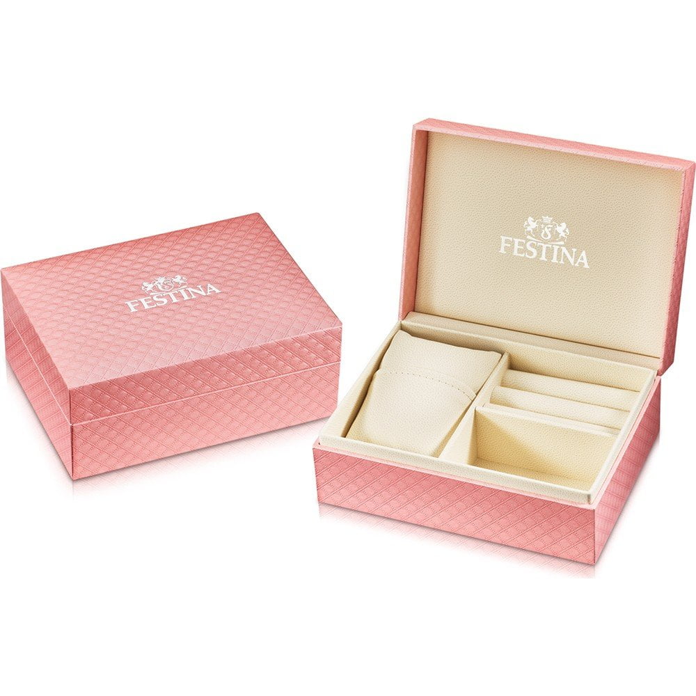 Vizualna podoba ure je ključni element, ki pritegne pozornost. Festina F20087-1 se ponaša z dovršenim in ženstvenim izgledom.