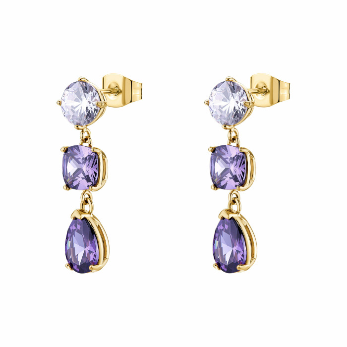 Uhani so sestavljeni iz treh visečih kristalov v nežnih vijoličnih odtenkih, ki se čudovito ujemajo z zlato osnovo. Ta kombinacija ustvarja luksuzen videz, ki pritegne poglede in poudari ženstvenost. Zaradi svoje oblike lepo podaljšajo linijo vratu in obraza, kar daje celotnemu videzu eleganten in sofisticiran pridih.
