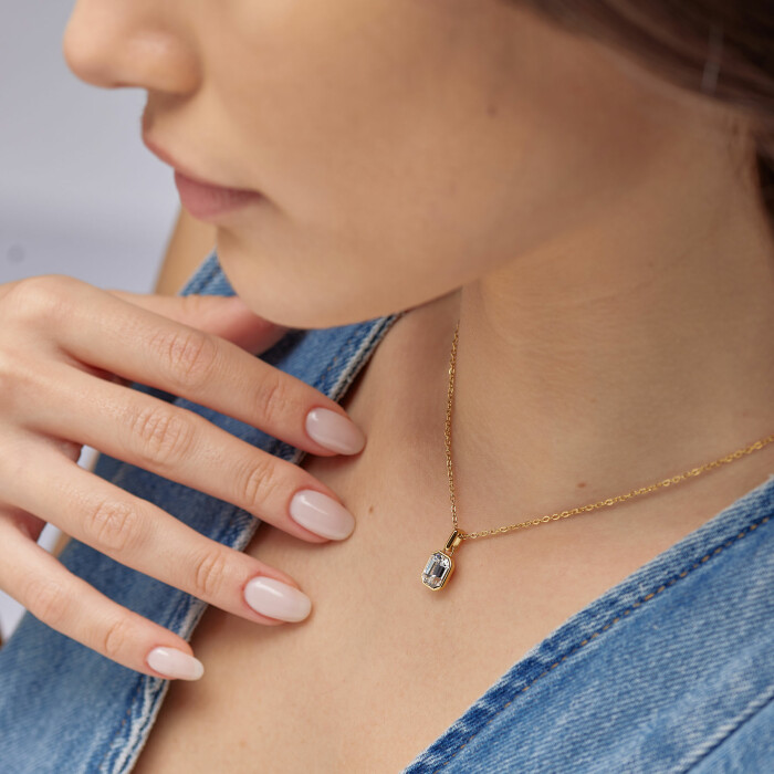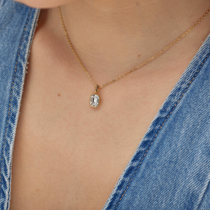 Ta kos je več kot le nakit – je izraz osebnega sloga in elegance. Izdelana iz visokokakovostnega nerjavečega jekla z zlatim pvd premazom, je odporna proti obrabi in nežna do kože. Verižica s pravokotnim cirkonom v središču dodaja ravno prav sijaja, da pritegne pozornost, ne da bi bila vpadljiva.