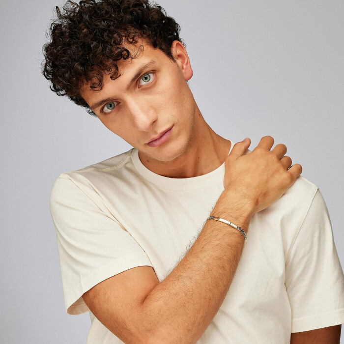 Minimalistična ploščica poudarja profesionalnost, robustna verižica pa karakter. Zapestnica ni le okras, temveč orodje za osebni branding in samozavesten nastop.