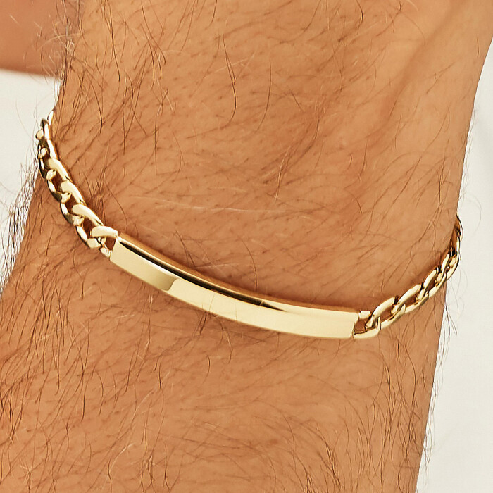 Zapestnico sestavlja močna verižica v zlati barvi, ki simbolizira stabilnost in moč, v osrednjem delu pa je gladka ploščica, idealna za gravuro imena, datuma ali posebnega sporočila.