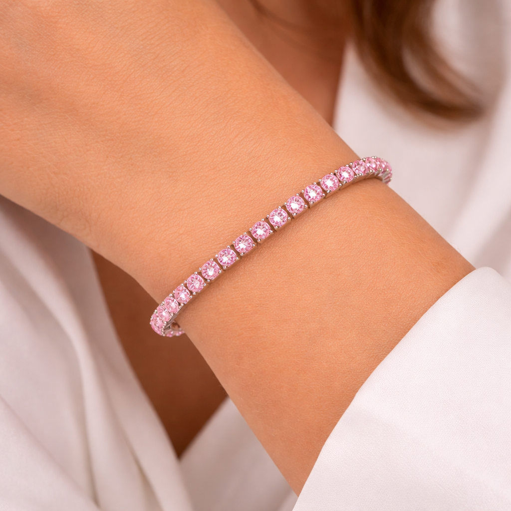 Roza kristali nežno ujamejo svetlobo in ustvarijo subtilen sijaj, ki je ravno prav opazen, da pritegne pozornost, a hkrati dovolj eleganten za vsakodnevno nošenje. Če si želite nekaj posebnega, a ne pretiranega – ste pravkar našli popolno zapestnico.