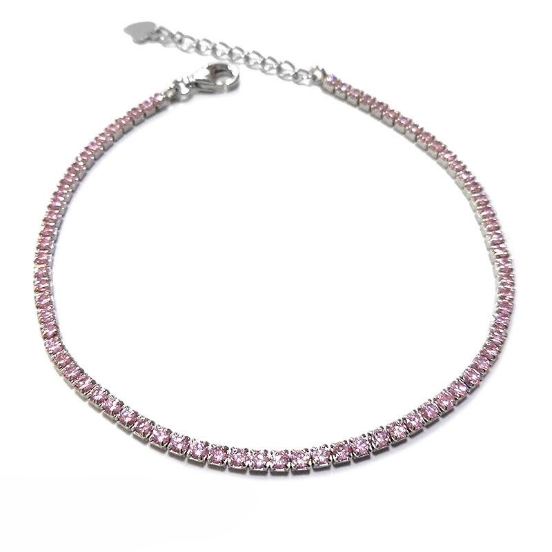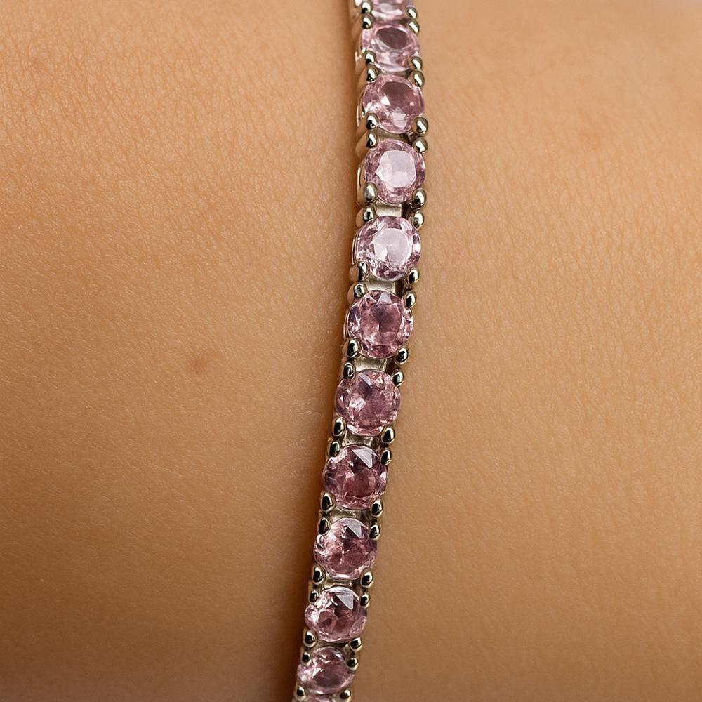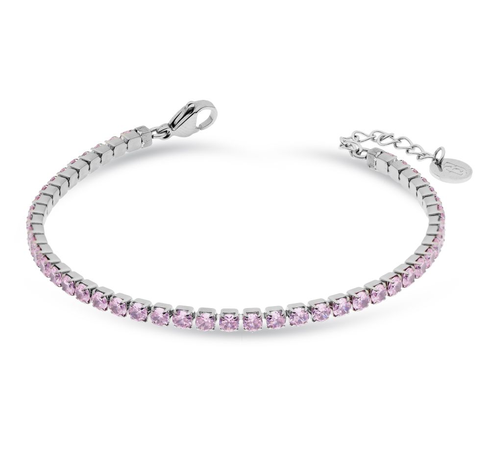 Posebnost te zapestnice so njeni drobni roza cirkoni, ki so skrbno nameščeni v enakomerni liniji. Njihova nežna barva ustvarja romantičen, ženstven in hkrati sodoben videz.